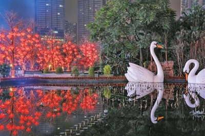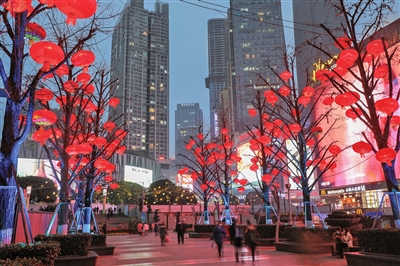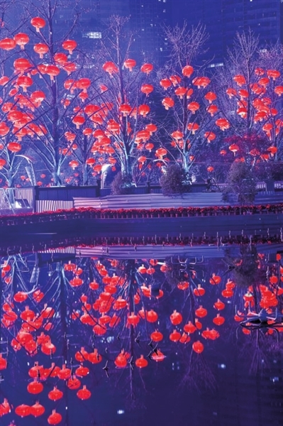 图①:观音桥商圈嘉陵公园里大红灯笼挂满树梢,节日气氛渐浓。
