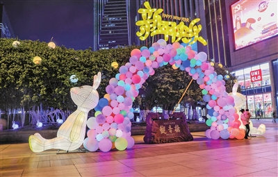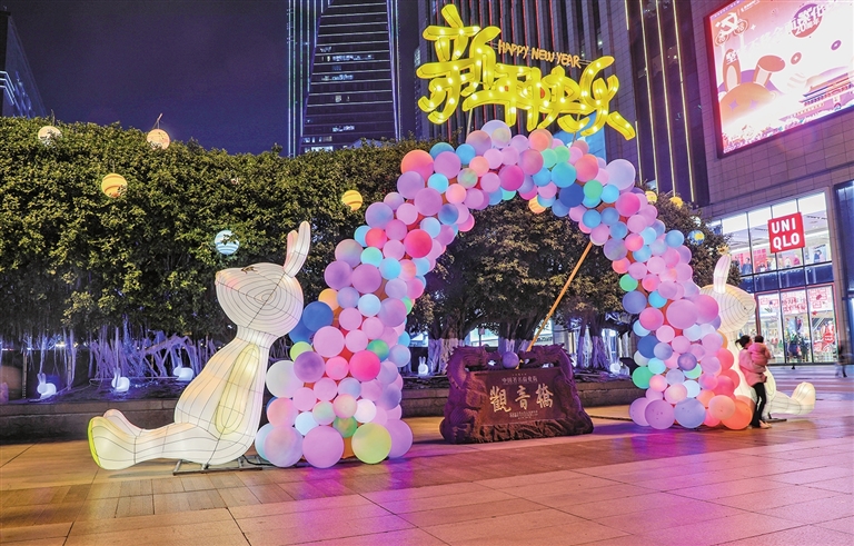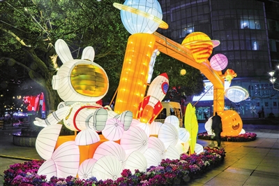 记者从区商圈办获悉,今年,观音桥商圈迎春灯饰以“逐梦天宫新纪元,国潮迎春贺新年”为主题,通过“卯兔、春节、天宫空间站、巴蜀地域特色”等元素进行展现,体现了我国传统佳节的喜庆祥和,巴渝之地的地域特色。同时,天宫空间站的“憧憬”则体现了我国在航空事业建设取得的骄人成绩。