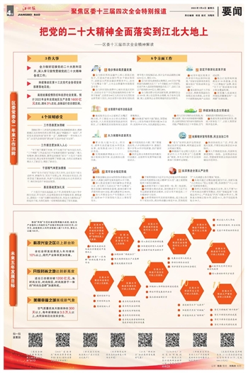 围绕区第十三次党代会确定的总体思路狠抓落实,精准把握江北优势特色和主要矛盾,提出“两副担子一起担”,开好优化营商环境“新年第一会”,精雕细琢“一带双核五片区”,区党代会谋划的“愿景画”正逐步变成“实景图”。