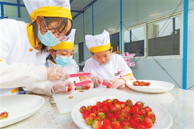 2月16日,培新小学的孩子们迎来一堂“香甜”的劳动课,采摘草莓、制作水果拼盘和冰糖葫芦,共同分享甜蜜的劳动果实。