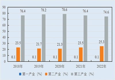 初步核算,全年地区生产总值[2]1602.8亿元,比上年增长3.7%,经济总量跃居全市第三位。其中,第一产业增加值1.3亿元,增长3.7%;第二产业增加值405.7亿元,增长12.6%;第三产业增加值1195.8亿元,增长1.0%。三次产业结构比优化调整为0.1:25.3:74.6。分产业看:金融业、工业、批发零售业三大产业增加值分别比上年增长2.8%、16.8%和4.4%。全年人均地区生产总值17.1万元,增长2.7%。民营经济增加值821.4亿元,比上年增长7.3%,高于全区GDP增长3.6个百分点,占全区经济总量的51.3%,较2021年提升1.4个百分点。