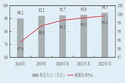 年末全区常住人口94.5万人,比上年增加1.6万人。其中,城镇常住人口94.0万人,占常住人口比重(常住人口城镇化率)为99.4%,比上年提高0.1个百分点。年末户籍总户数28.0万户,年末户籍总人口65.4万人。其中,城镇人口63.9万人,男性年末户籍人口31.9万人,女性年末户籍人口33.5万人。
