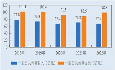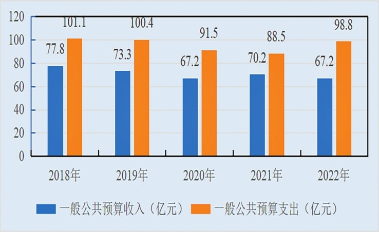 2022年,全区一般公共预算收入67.2亿元,比上年下降4.3%。全年区级税收收入58.4亿元,下降1.9%。其中,增值税、企业所得税、个人所得税分别为18.1亿元、10.6亿元、2.9亿元,分别占税收比重31.0%、18.2%、5.0%。全年完成一般公共预算支出98.8亿元,比上年增长11.7%。