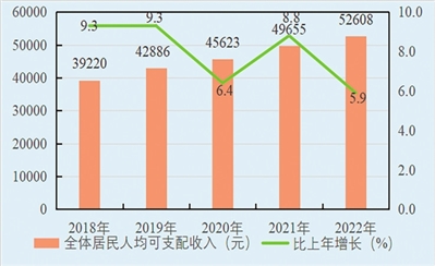 全年全区居民人均可支配收入52608元,比上年增长5.9%。按常住地分,城镇居民人均可支配收入52788元,增长4.5%;农村居民人均可支配收入27470元,增长5.8%。城乡居民人均可支配收入比值为1.92,比上年缩小0.02。全年全区居民人均消费支出31571元,比上年增长7.7%。