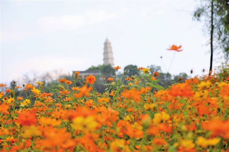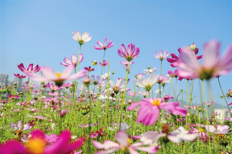 除了波斯菊开出的灿烂花海,还有金灿灿的硫华菊也花开正茂。繁盛的鲜花组合映衬着蓝天白云、高楼大厦,让人心旷神怡。
