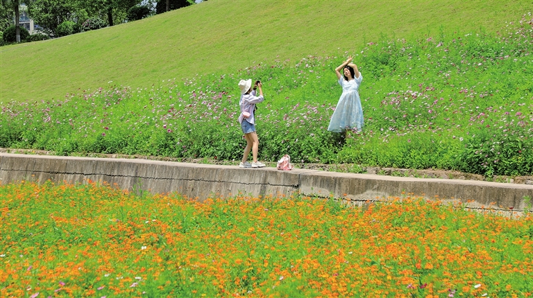 “走,溉澜溪体育公园看花去!”近日,在溉澜溪体育公园,成片波斯菊迎夏盛开,紫红、粉红和白色的花朵交叉分布,绿意盎然的公园仿佛披上了一袭彩色花衣,引来不少市民游客赏花观景。