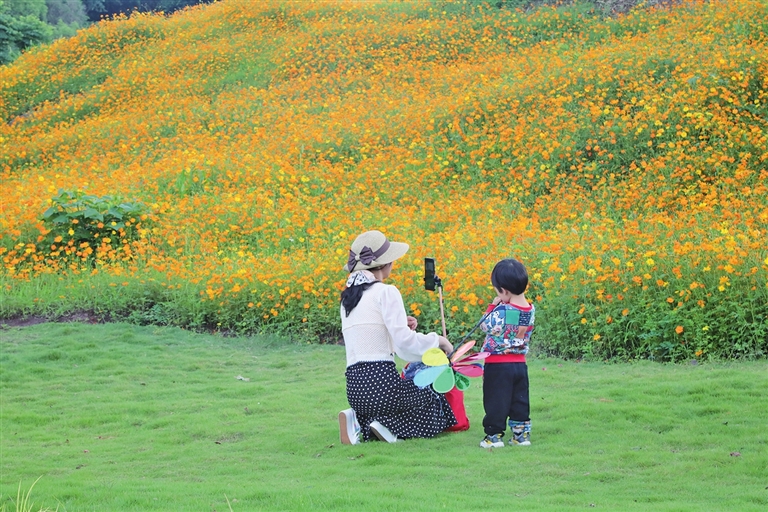 经过几个月的精心管护,硫华菊迎来了盛花期,波斯菊也相继开放。一望无际的花海吸引了众多市民前来打卡游玩。