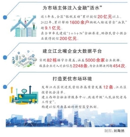 这是我区通过“银税互动”工作,将企业的“纳税信用”和“融资信用”无缝对接,破解了小微企业融资难题的一个缩影。近5年来,全区“银税互动”已累计授信20亿元以上。2022年,累计帮助1600余户纳税人输送资金“血氧”超9.1亿元。同时,我区发挥西部金融中心核心承载区优势,在全市率先建设“1+5+N”金融港湾,助推民营小微企业获得授信200亿元,为市场主体注入源源不断的金融“活水”。