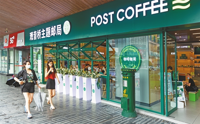 7月24日,观音桥商圈邮局咖啡,经典的邮政绿与咖啡有机融合,市民不仅能在这里办理邮政业务,还可以坐下来享受一杯咖啡的惬意,让快节奏的生活在这里慢下来。记者 刘陶然 摄影报道