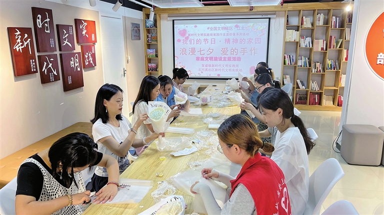 8月21日,复盛镇祥韵社区新时代文明实践站开展了以“渡七夕良辰,传文明家风”为主题的文明实践活动。活动通过分享文明家风、分享爱情故事等,倡导广大群众树立追求美好生活和坚贞爱情的婚姻爱情观。当天下午,石河溪社区新时代文明实践站开展“浪漫七夕,爱的手作”家庭文明建设主题活动,辖区内20位居民参与仿真玫瑰手工花束制作活动。(本报综合)