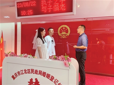 8月22日,区民政局婚姻登记处携手美团、顺丰速运重庆有限公司、星光社会工作服务中心开展以“情定七夕,为爱添喜”为主题的系列庆祝活动,为新婚夫妇送祝福、添喜气。当天,有百余对新人办理了结婚登记。区民政局为新人们举行“幸福见证官”颁证仪式及“开创幸福新生活”新婚主题沙龙分享活动。区婚姻登记处负责人介绍,为了保证“七夕”节婚姻登记处各项工作顺利开展,为新人提供优质高效服务,区民政局优化办证流程,延长办公时间,提升婚姻登记服务质量,保证婚姻登记工作顺利进行。