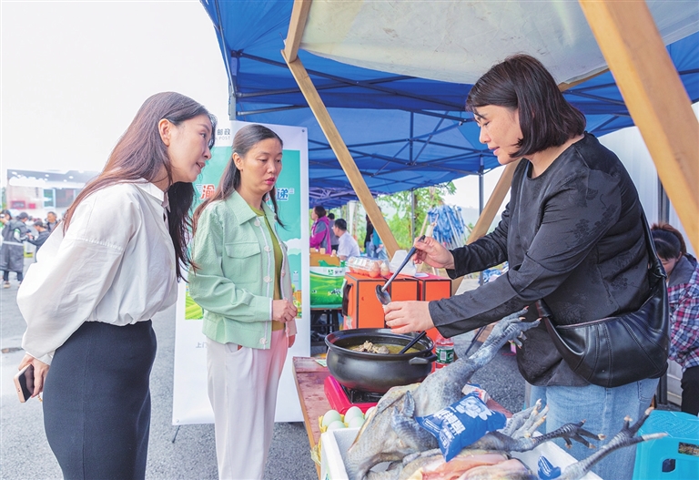 映月阁的跑山土鸡、土鸡蛋一摆上桌子就受到关注。一锅鸡汤飘香四溢,引得大家驻足品尝。“粮食喂养,绝不掺假!”在品尝以后,土鸡、鸡蛋立即成了抢手货。