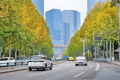 北滨路、江北嘴、余溪路、天竺路等路段,梧桐树叶逐渐变黄,翠绿色、金黄色、焦糖色层层叠叠,与城市道路形成了“一路一景”的靓丽风景线。阳光洒下,光影散开在树下,行人、车辆穿行其间,微风徐徐,树叶飘动,画面如油画般斑斓。