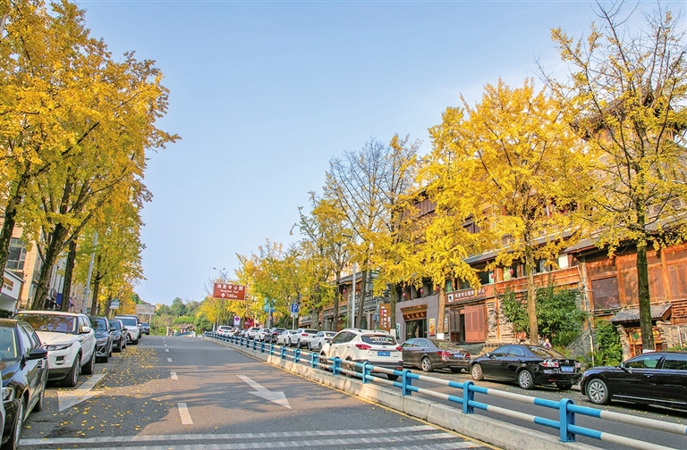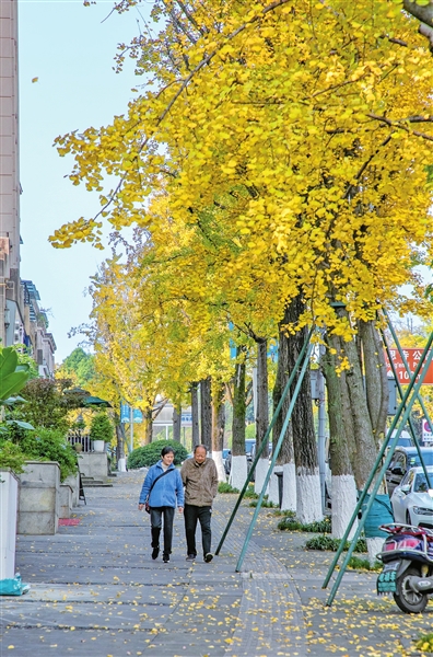 在观音桥街道鸿恩路两旁,一棵棵银杏树沿街而立,枝头挂满金黄彩条。随着微风不时拂过,树叶犹如金色蝴蝶般飞舞并飘落地面,极具诗意。