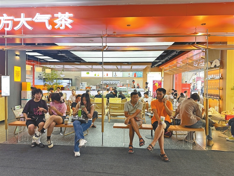 最热潮流服饰品牌BF(BASEMENT FG)重庆首店正坐落于此,两层楼4000平方米,有最新的潮流服饰和限量商品,吸引了不少市民来此购物。饮品店门口,同样坐满了消费者。有人和朋友闲聊,有人在一旁默默玩着手机。每一桌顾客均未出现大声喧哗、干扰他人、破坏公共设施等行为。