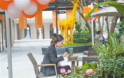 步入街区,绣球花、月季、玫瑰点缀在街区的各个花池,让人倍感惬意。整个街区以橙色作为主打色,一只元气满满的“小橙子”就是街区的“形象代言”,让人感觉温暖可爱又充满活力。此外,街区还吸引了江北首家鸟咖店、法式怀石料理店等众多特色店铺入驻。