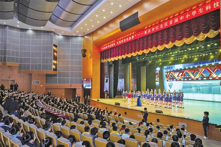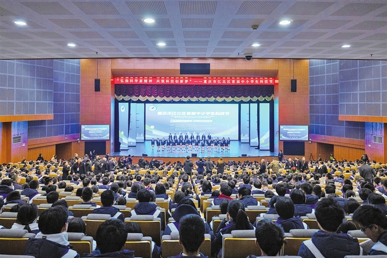 上午9点,江北区首届中小学生科技节启动仪式在鲁能巴蜀中学大礼堂盛大举行。开场之际,歌曲表演《飞翔的路》《祖国不会忘记》奏响科技与艺术融合的激昂乐章,烘托出热烈而庄重的氛围。