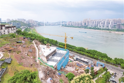 川江航运文化园项目位于朝天门大桥北桥头及桥下,用地面积38400平方米,配套建筑规模3192平方米,目前正在紧张地进行搭建支模架、安装模板、室外景观打造等作业。