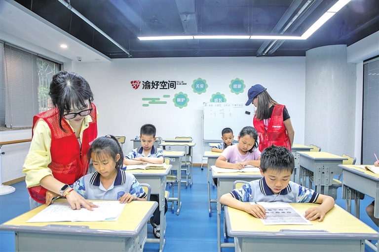 下午四点十五分,南桥寺社区的“渝好空间”准时热闹起来。刚放学的孩子们轻车熟路地找到自己的座位,开始写作业或参加兴趣活动。吴阿姨透过玻璃窗看了一眼认真写字的孙子,放心地走进了隔壁的舞蹈教室。
