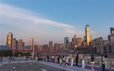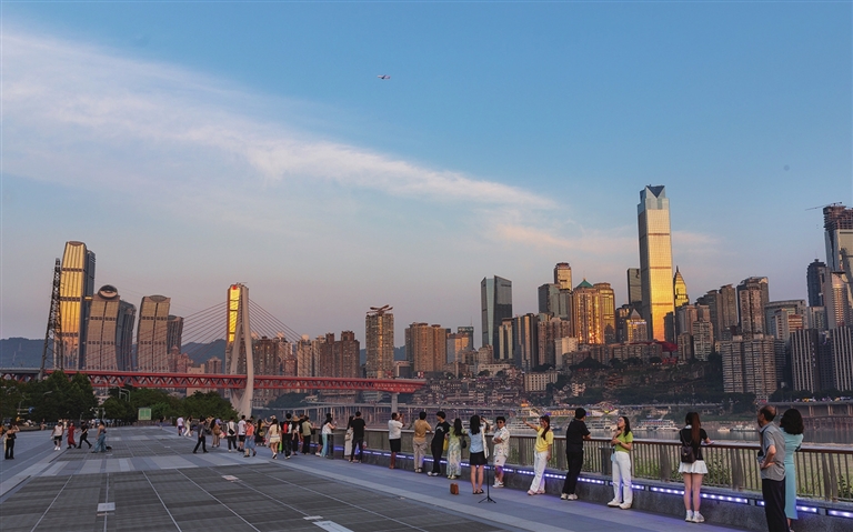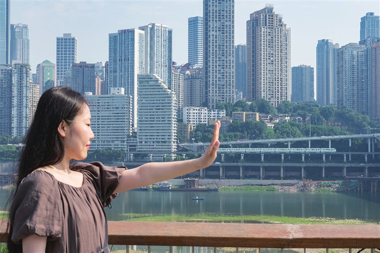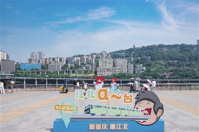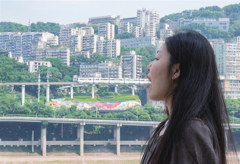 沿北滨路走向江北a~台,临江平台藏着更野的玩法:当重庆轨道交通2号线从a~台上方的轨道洞“钻”出时,张开双臂就能上演“吞轨”大戏。