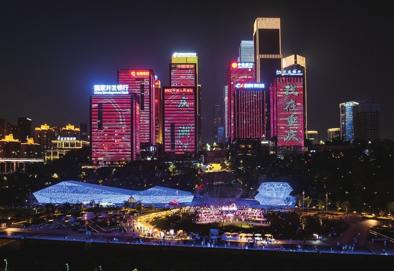 傍晚时分,夕阳给单轨镀上琥珀色光晕,玻璃幕墙反射的碎金光斑与列车灯带缠绵共舞,随手按下快门就是赛博朋克电影的分镜——左手是曼哈顿式的摩天楼森林,右手是嘉陵江蒸腾的人间烟火,浪漫的钻石广场镶嵌其间璀璨夺目,连晚风都带着光影交错的热辣魔法。