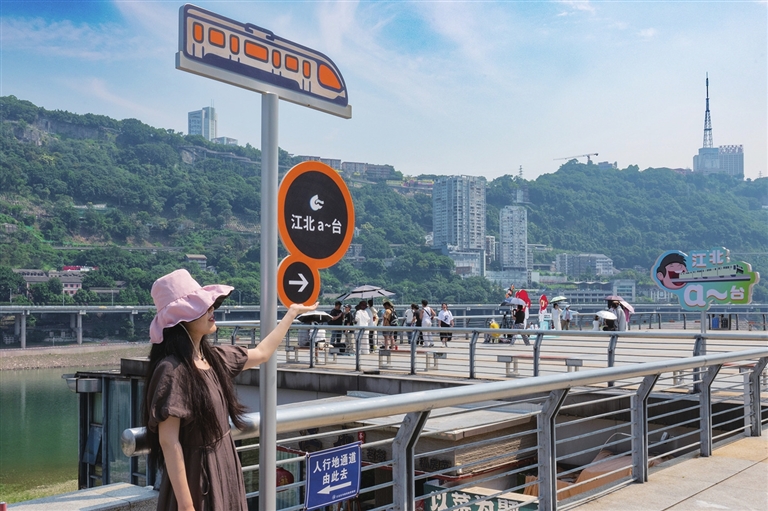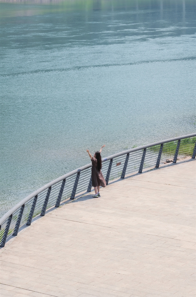 逐级而下到下层平台,嘉陵江碧绿的波心倒映着天空,随手一拍就是“山城小洱海”的错觉,单轨列车从远处桥洞钻出时,恰如海豚跃出碧海的瞬间。