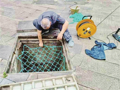 据悉,5月30日以来,观音桥街道以“小井盖、大民生”为切入点,对辖区化粪池井盖进行全面排查,为鹏润蓝海A区9个存在安全隐患的井盖加装了防坠网,切实守护居民“脚底下的安全”。图为鹏润蓝海物业工作人员正在安装防坠网。