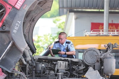 “车子多停一会儿,温度会降一些下来,但如果每台车多停几分钟,来办事的群众就要多等很久。我们多热一会儿,群众就少热一会儿。”为了采集到车辆准确清晰的轮胎规格、底盘、车身及附属设备信息等关键要素,车管所副所长贾建伟需要趴在滚烫的地面或者长时间蹲伏在晒得烫人的车体旁。查验完一上午的车辆,贾建伟的后背结下一大片盐渍。