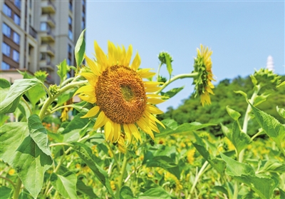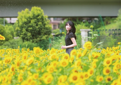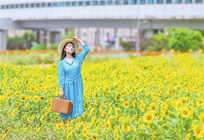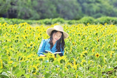 沿着两旁缀满百日菊的小径前行,一转弯,一定会惊呼一声。这是闯进了金黄色的世界!金灿灿的向日葵田在阳光下反射着耀眼的光芒。