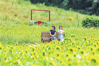 一片巨大的向日葵花田正值花期。这里的向日葵像一群痴迷的追光者,花盘仰得老高,金黄色花瓣仿佛把阳光都揉碎在了脸庞。走在花田里,连影子都被染成了暖黄色。夏天的调色盘,在这里被彻底打翻了。