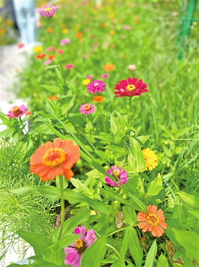 最先闯入眼帘的是满目的百日菊。它们像孩童手中调皮的彩色笔,把颜色撒了一地。粉的像揉碎的晚霞,紫的像打翻的葡萄汁,白的像天上坠落的云絮。