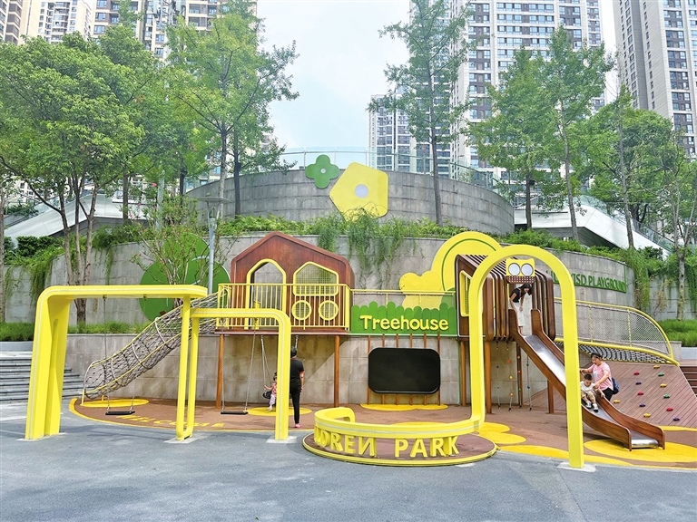 20多米高差的天然坡地,给人以层次丰富的观江视野。楼梯沿途点缀绿植鲜花与休闲外摆区,不少家长正带着孩子在公园内的游乐设施中尽情玩耍。“现在吃完晚饭散个步,几分钟就能走到江边,还可以顺路喝杯咖啡,真的太惬意了!”融景城居民胡云婷说。