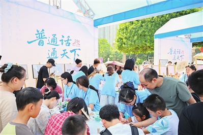 现场还举办语言文字主题成果展,为市民、游客带来普通话水平模拟测试、无人机推普应用展示、诗词接龙闯关等沉浸式体验,现场市民游客纷纷打卡参与。