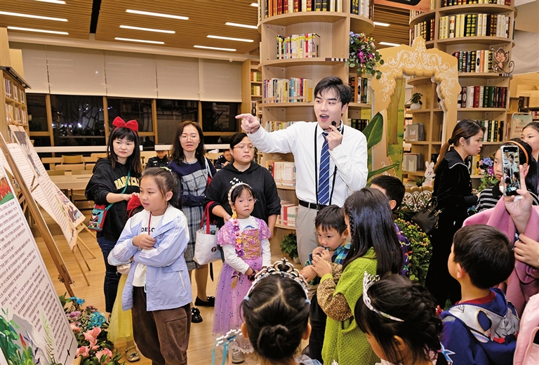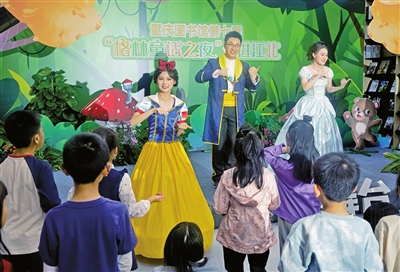 盛装出席的公主、王子们向大家热情挥手,漂亮的公主给大家声情并茂地讲着童话里的故事,小朋友听得津津有味。阶梯阅览区座无虚席。家长们陪伴着孩子阅读新奇的立体绘本。“真的好漂亮,好有意思!”7岁的杨依依小朋友在爸爸陪伴下阅读《国宝立体书》,探寻国宝背后的故事。杨爸爸告诉记者,得知“格林童话之夜”举办的消息后,幸运地抢到了票。“格林童话之夜”不仅给了孩子幸福的童年记忆,也让家长重返童年,在轻松愉快的氛围中领略名著魅力,“谢谢‘格林童话之夜’守护孩子们的童心。”