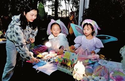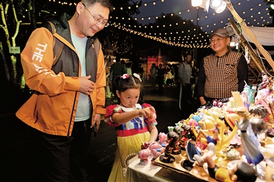 格林夜市也是人气所在。绘本、饰品、玩具、美食、手工工艺品……主办方还特意邀请来了非遗糖画、非遗刺绣等。整条街灯火通明,种类琳琅满目,处处欢声笑语。